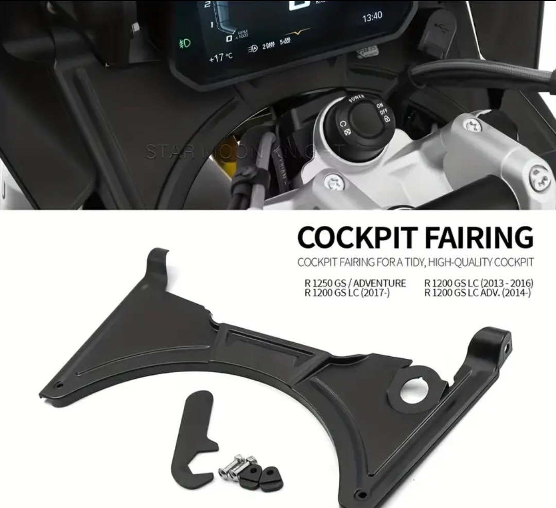 Improve wind deflection and enhance the look of your front end with this streamlined black R1200GS / R1250GS cockpit fairing, designed for the BMW R1200GS/ R1250GS. Made from durable ABS plastic with a matte black finish, this fairing adds both function and style — giving your bike a sleeker, more aggressive appearance while protecting cockpit electronics from wind and light debris.